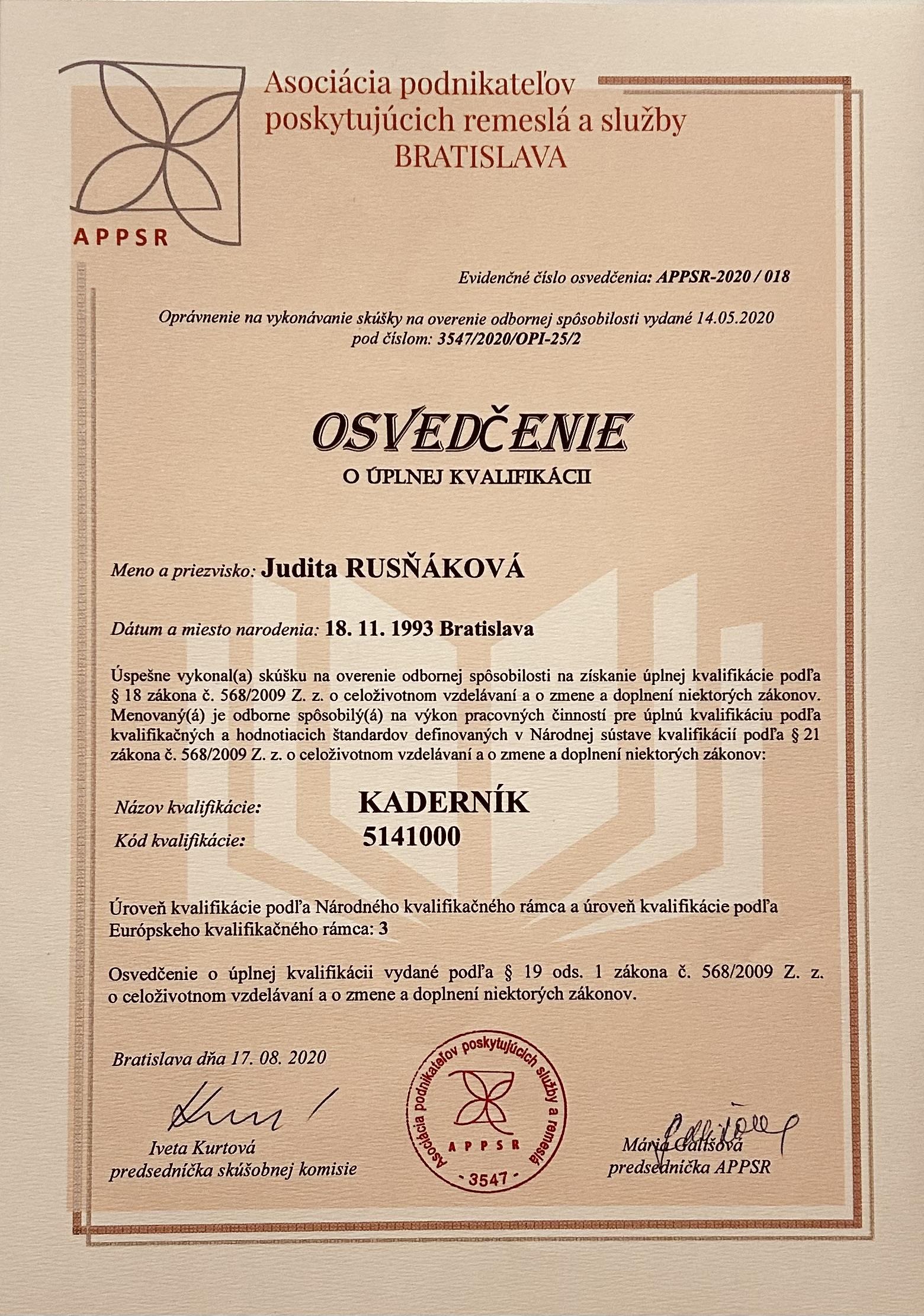 Profesionálnemu líčeniu a vlasovému stylingu sa venujem už niekoľko rokov. Vzdelanie som získala na prestížnej škole Make-up Institute Prague a cenné skúsenosti pod značkami Bobbi Brown a Zerva Cosmetics. Pracovala som aj pri foteniach, natáčaniach a v umeleckom prostredí Slovenského národného divadla, kde som si osvojila precíznosť a cit pre detail.